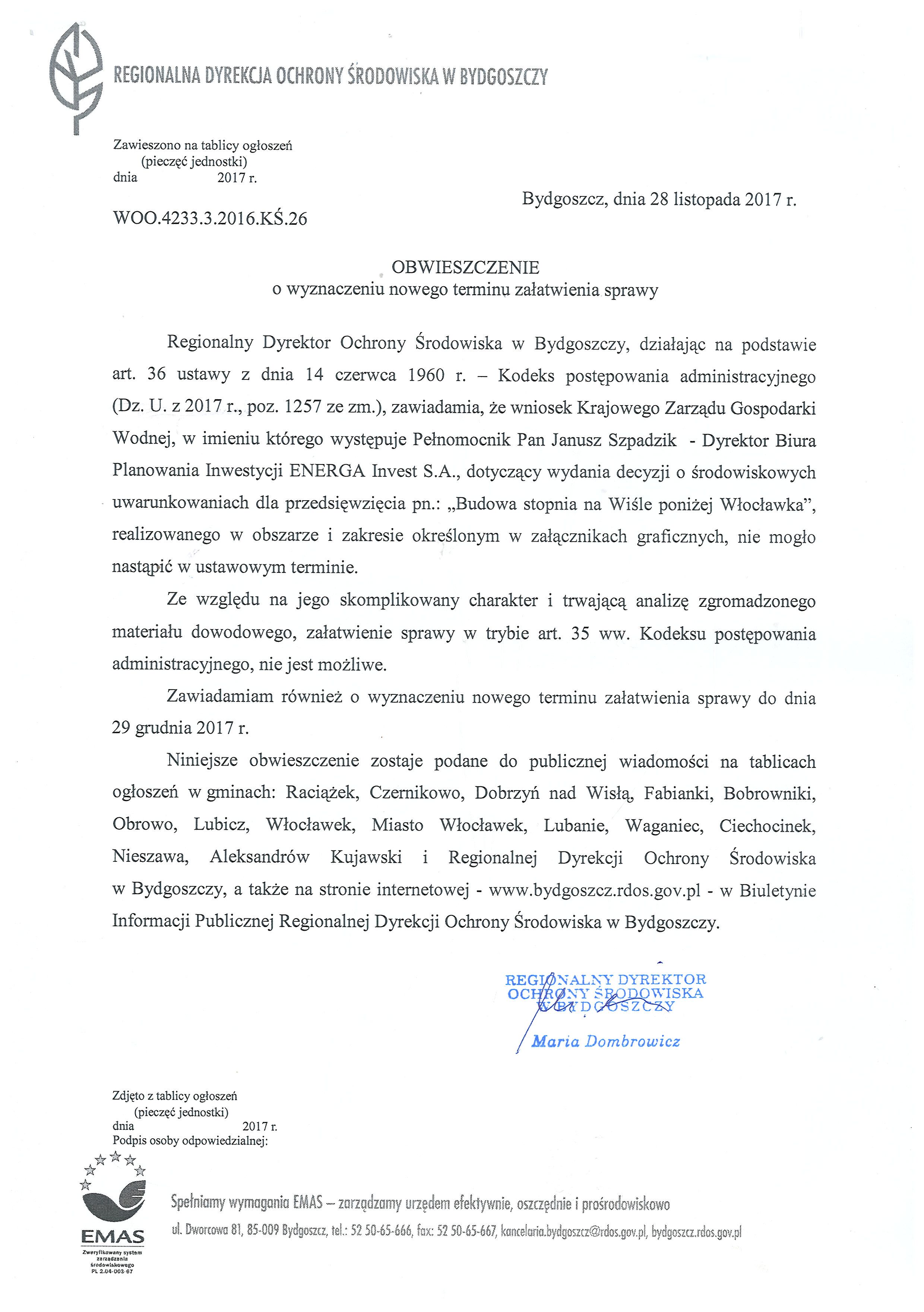 Obwieszczenie Regionalnego Dyrektora Ochrony Środowiska w Bydgoszczy w sprawie budowy stopnia wodnego na Wiśle poniżej Włocławka.05.12.2017