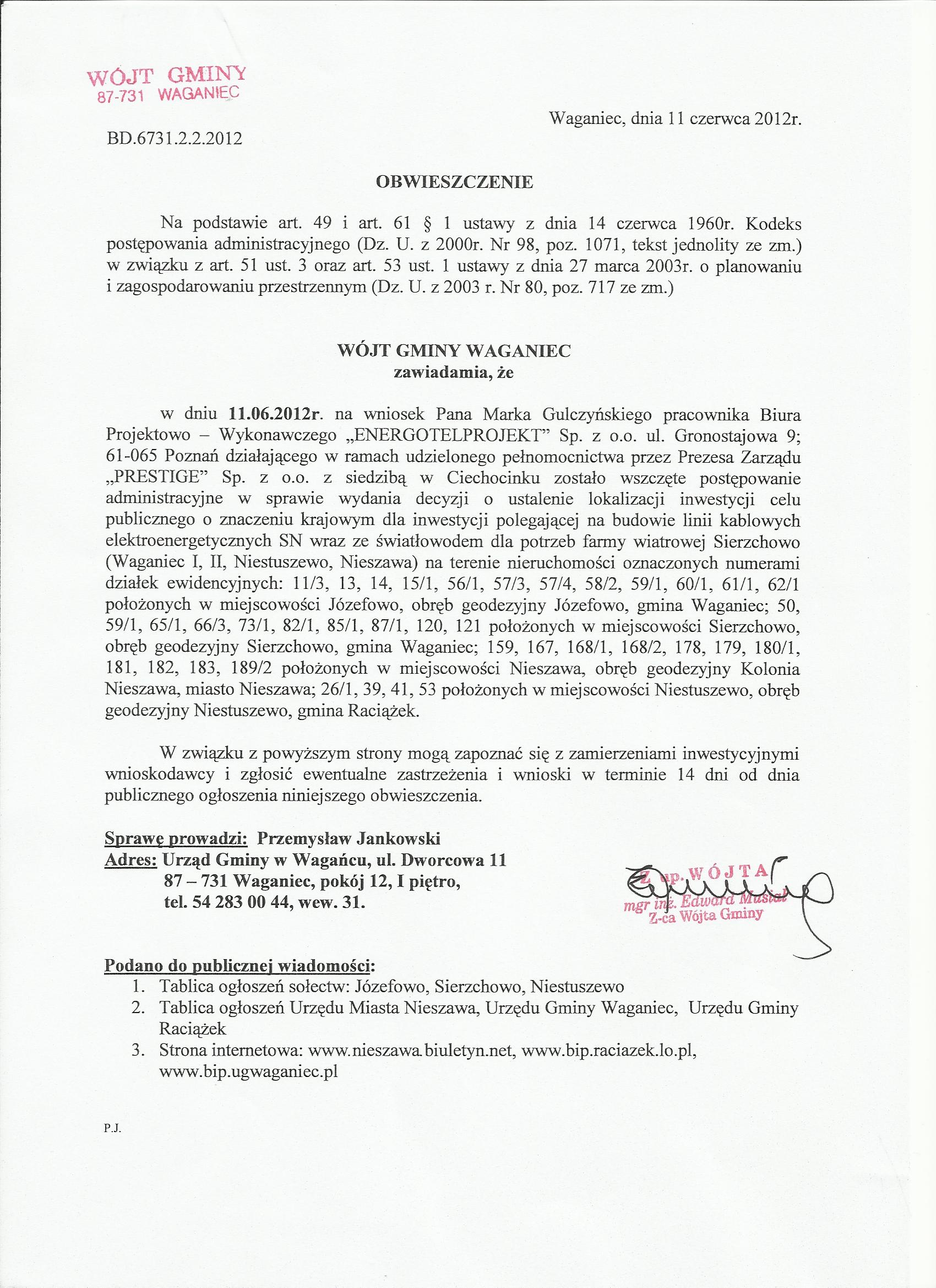 Zawiadomienie o wszczęciu postępowania - Gmina Waganiec14.06.2012