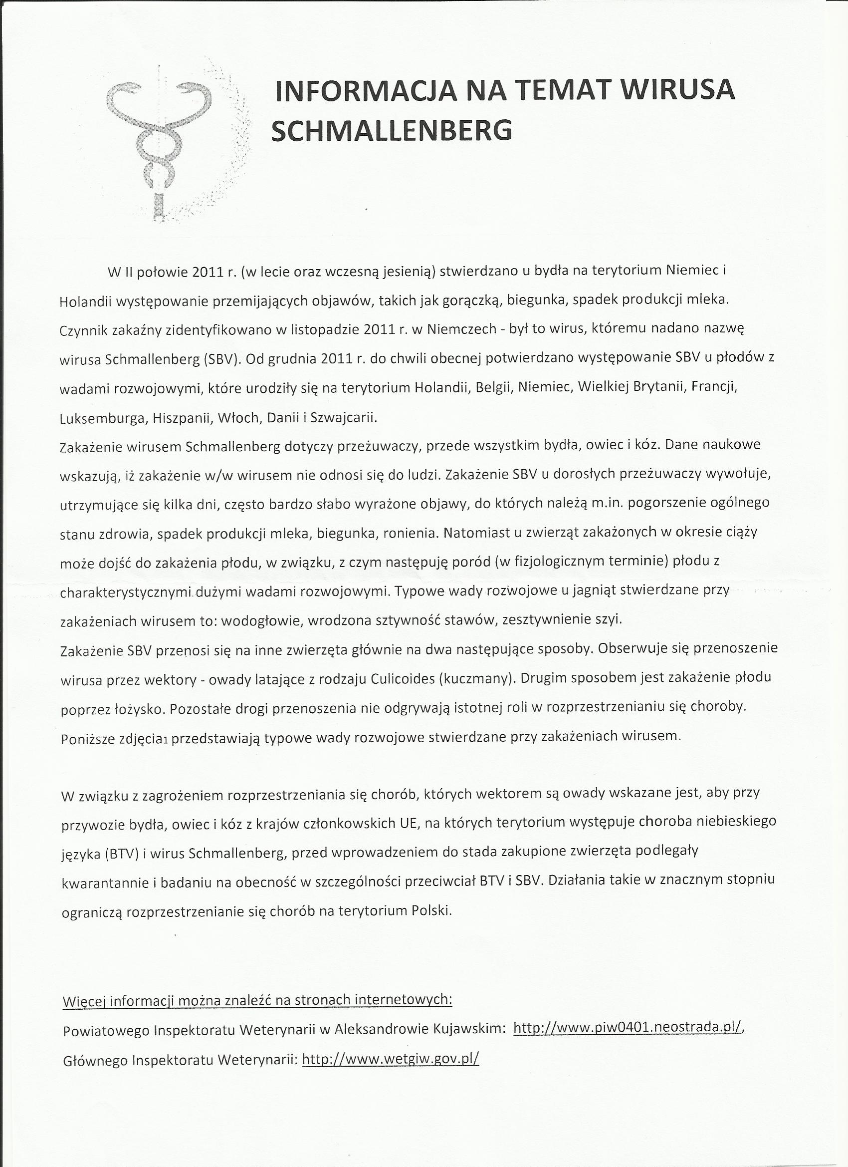 W załączeniu przekazuję informację Powiatowego Lekarza Weterynarii dotyczącą wirusa Schmallenberga.