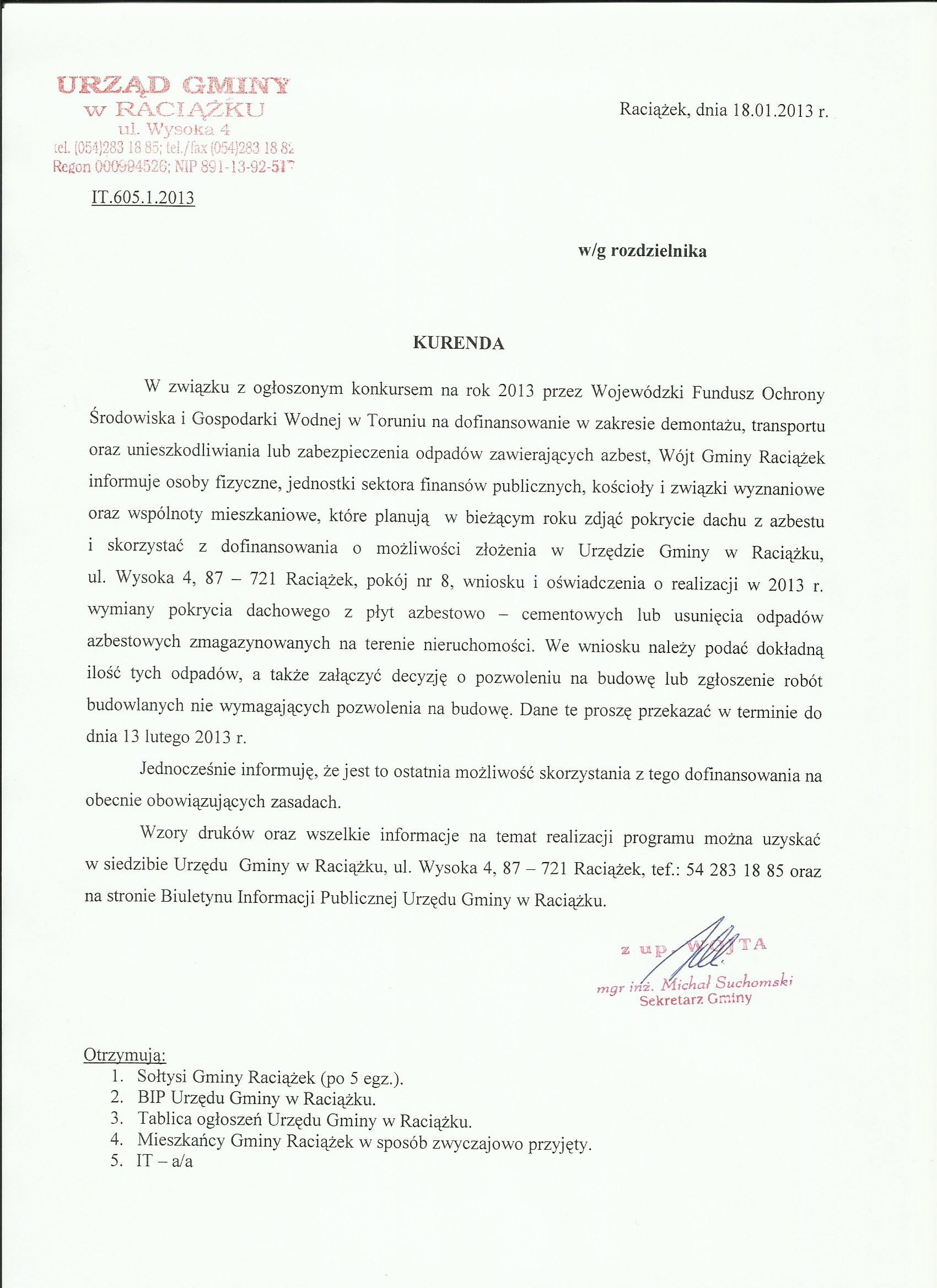 KURENDA ws. demontażu, transportu oraz unieszkodliwiania lub zabezpieczenia odpadów zawierających azbest18.01.2013