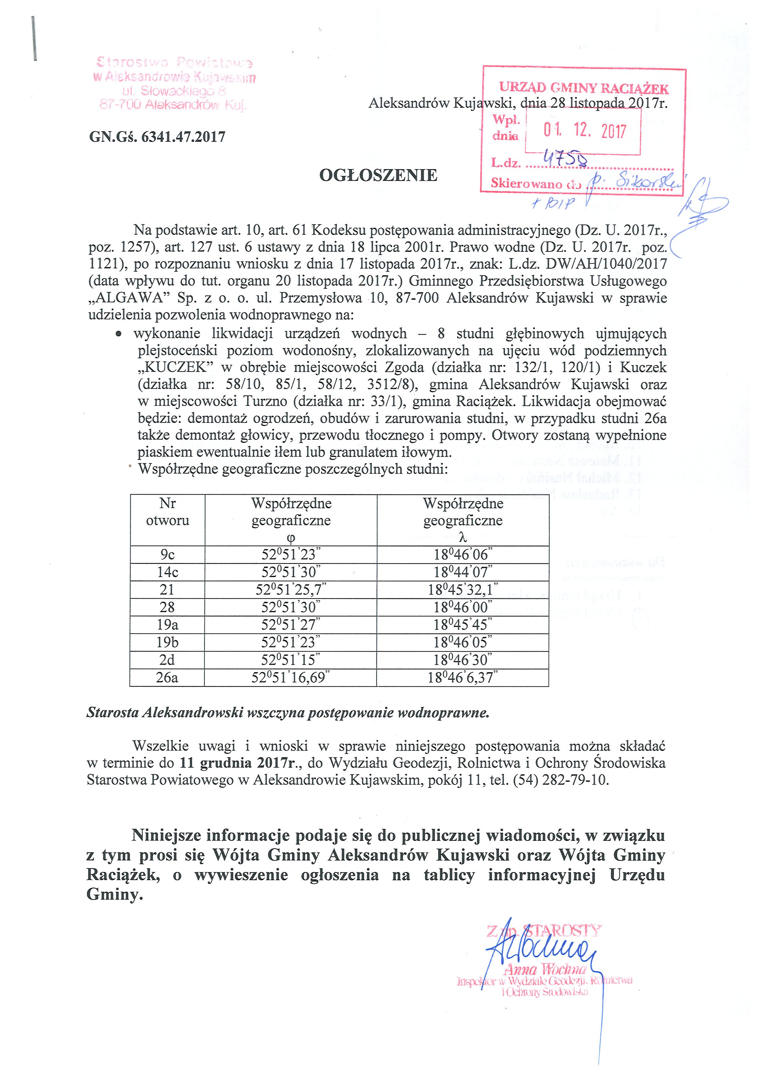 Ogłoszenie Starostwa Powiatowego w Aleksandrowie Kujawskim o udzieleniu pozwolenia wodnoprawnego. 04.12.2017
