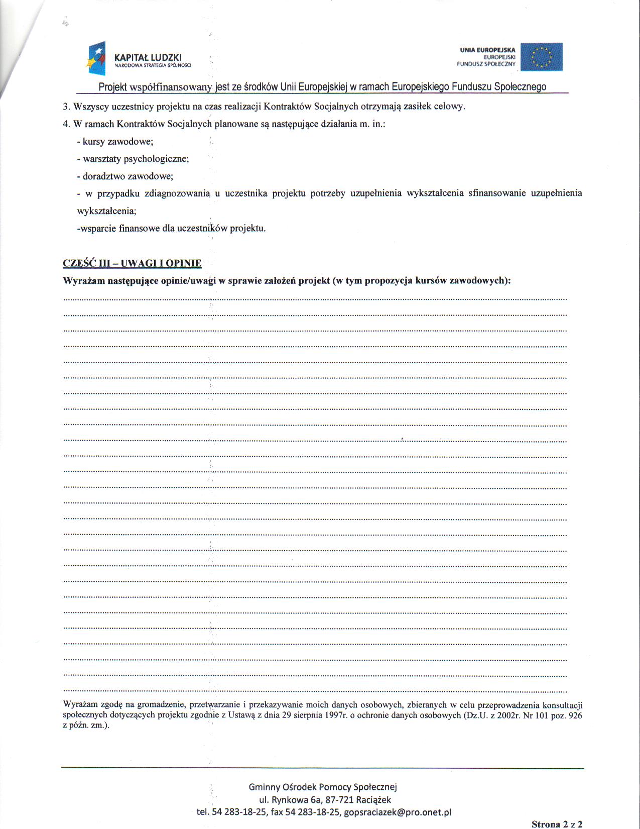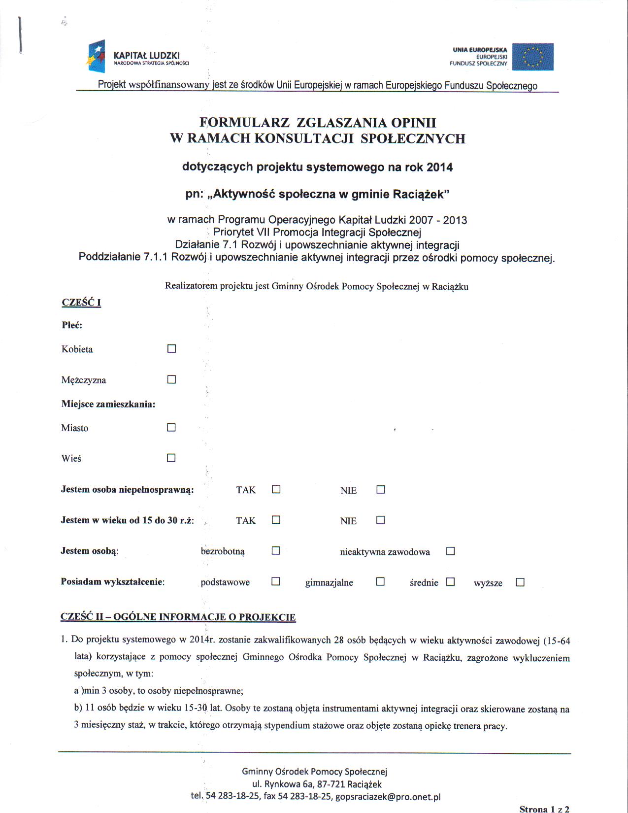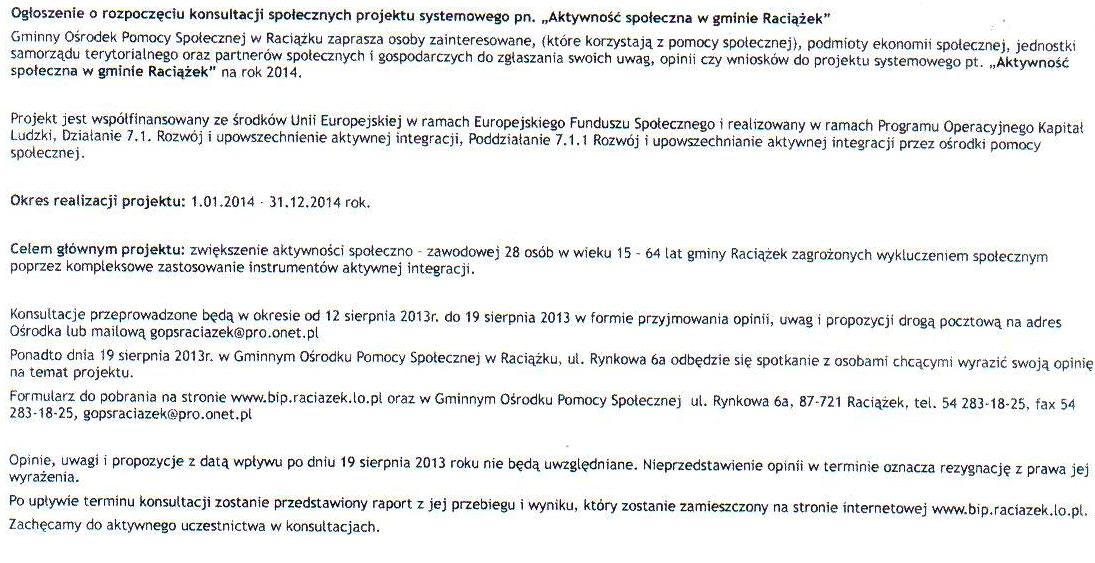 Ogłoszenie o rozpoczęciu konsultacji społecznych projektu pn. 'Aktywność społeczna w gminie Raciążek'13.08.2013
