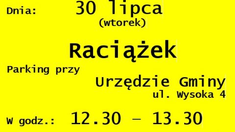 30 lipca 2024r. (wtorek) przy budynku Urzędu Gminy w Raciążku odbędzie się bezpłatne komputerowe badanie wzroku z OPTO – BUS. w godzinach 12.30-13.30. Zapisy pod nr telefonu: 570 107 107.