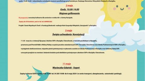 Organizator: Gminny Ośrodek Kultury w Raciążku Współorganizator: Ochotnicza Straż Pożarna w Raciążku, Gminny Ośrodek Pomocy Społecznej, Parafia w Raciążku, Szkoła Podstawowa w Raciążku MAJÓWKA 2024 1 maja Piknik majowy na placu przed OSP godz. 15.00-18.00 w programie: malowanie buziek, warsztaty…
