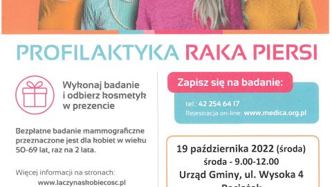 Badania mammograficzne w miejscowości Raciążek w dniu 19.10.2022 środa – 9.00-12.00, Urząd Gminy, ul. Wysoka 4, Raciążek Więcej…