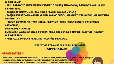 Dzień Dziecka Na wesoło Dnia 05.06.2022r (niedziela) , godz. 14.00 – 18.00 , miejsce: gminne boisko sportowe W programie: – gry i zabawy z animatorami (zabawy z chustą animacyjną, bańki mydlane, klocki giganty itp.), – zajęcia sportowe m.in. bieg przez płotki,…